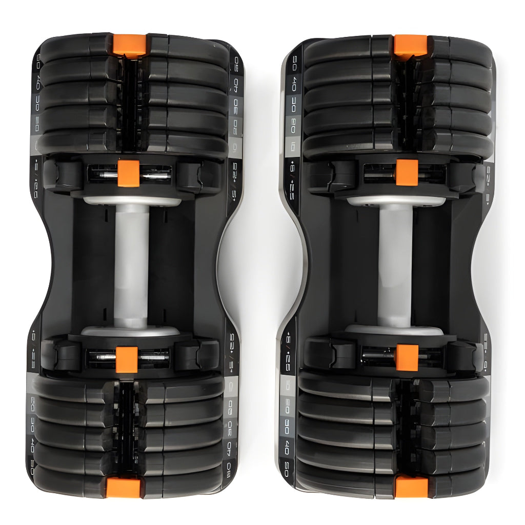 Each 55 Lb. Select-A-Weight adjustable dumbbells feature 15 weight adjustments, including: 10, 12.5, 15, 20, 22.5, 25, 30, 32.5, 35, 40, 42.5, 45, 50, 52.5, and 55.